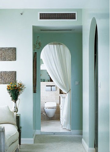 灰湖綠的主臥,自然舒緩,讓人輕盈地沉淪與迷醉。拱門的弧線柔和了臥室的平直線條,潔白的細(xì)亞麻門簾的使用也為私密空間添加了浪漫唯美的情調(diào)。