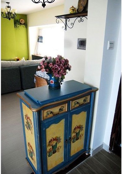 進(jìn)門口又是一個(gè)鞋柜,開來這家的女主人鞋真是多呀,呵呵 愛漂亮是每個(gè)女人的天性,可以理解!燈具與置物架都選用鐵藝材質(zhì)的顯得主人時(shí)尚前衛(wèi)。