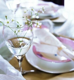 花朵更顯酒杯的剔透與晶瑩,仿佛使冰冷的餐具有了生命;酒杯更顯花朵的潔白,細軟的花枝也給用餐區(qū)渲染出靜謐的喜悅之情。