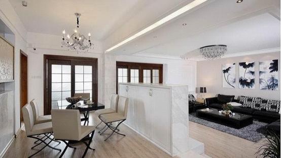 互補(bǔ)才能相得益彰,在空間里,設(shè)計(jì)師沒有過度的去追求新時(shí)代的簡(jiǎn)約設(shè)計(jì),在大面積采用簡(jiǎn)潔手法的同時(shí),用復(fù)雜的墻紙或裝飾來烘托出整個(gè)空間的亮點(diǎn)所在。電視背景墻集美觀與實(shí)用于一身,客廳面看過去是個(gè)造型美觀的電視背景墻,從餐廳觀望過去,卻是個(gè)功能強(qiáng)大的儲(chǔ)物柜。隔斷使得空間更為通透和大氣。