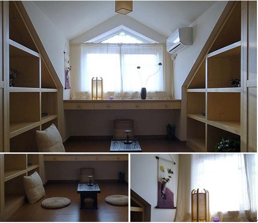 線條簡單的茶室設計,時尚簡約的壁柜,環(huán)保原木色調(diào)。深棕色實木地板,小茶幾,日式小蒲墊。都給人一種大自然樸實的感覺,舒適而環(huán)保。時尚簡約的窗戶設計,充足的自然光照亮整個小茶室,清新而雅致。