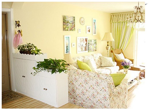 綠意濃濃的居室色彩搭配,綠與白的窗簾、靠枕色彩一致,大面積乳白色、暖黃色背景墻與沙發(fā)、布藝,共同營造了一個溫馨而暖意洋洋的居室空間。