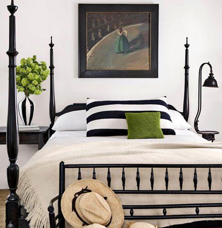 黑白配一直都是很經(jīng)典的搭配,黑色給人的印象是強硬和冷酷,這里的經(jīng)典黑白運用,再一次將古典與現(xiàn)代的風(fēng)格結(jié)合的完好無損。白色壓陣,任由黑色演繹它獨有的風(fēng)尚底蘊。值得一提的是,綠色植物的加入,給這個臥室?guī)砹舜笞匀坏奈兜溃亲永锷l(fā)著一股濃郁的鄉(xiāng)村之情,讓入住的人身心松弛愉悅。