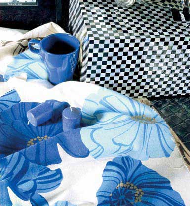 景泰藍工藝版畫效果的插畫圖案棉布,線條流暢,畫面色彩立體感強、現(xiàn)代與古典氣息濃厚,同時其質地細密綿厚,可以在空間做大面積鋪陳,營造出一種充滿個性的藍調空間,搭配深色高光感家具,有時尚藝術風情。