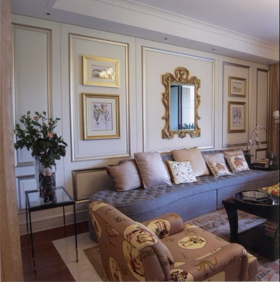 這是一戶高層豪宅,電梯直接入戶。古典主義的裝飾風(fēng)格讓空個空間充滿了精致、典雅、唯美的氣息。然而,設(shè)計師試圖通過一些材料——銀箔細(xì)條的植入,為這個空間增添一些特殊的氣質(zhì)。墻面中嵌入的銀箔細(xì)條仿佛是一道清涼的風(fēng)景,為整體莊重的古典風(fēng)格憑添了幾分現(xiàn)代時尚的氣息。