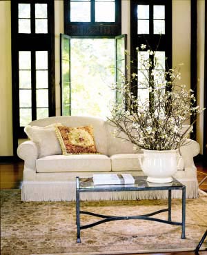 比如:在起居室一角,因?yàn)殚_(kāi)了一扇弧形窗,則可以在窗前擺放一張同樣具有弧形椅背的休閑椅。