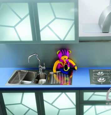 櫥柜的外形采用非?,F(xiàn)代的暗影玻璃門(mén)板和弧形煙機(jī),這種造型的制作工藝復(fù)雜,所以視覺(jué)效果很不一般。玻璃柜門(mén)的內(nèi)框可以透過(guò)光線,推開(kāi)寬大的玻璃柜門(mén),就像把一方澄澈的天空擎在頭頂。