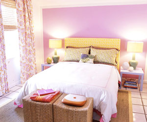 用亮麗耀眼的色彩粉刷一面墻壁,是打造家居看點最快、最有效的方法。紫紅色甜美而溫馨,但如果刷滿四面墻,就顯得太過瘋狂和病態(tài)了。在這個案例中,一面墻適當?shù)厥褂昧俗狭_蘭色,與黃色床頭板形成對比,突出了床這一“主角”。