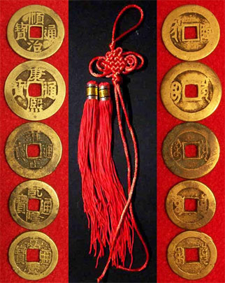 六帝錢是順治、康熙、雍正、乾隆、嘉慶、道光六個(gè)皇帝的銅錢,用處與上面一樣,但它們的區(qū)別在于六帝錢可?;妩S煞、二黑煞,六為六白乾,性質(zhì)是金,五黃、二黑煞都是土旺,以土生金泄氣化煞(風(fēng)水宜泄不宜斗)。其實(shí)六帝錢在實(shí)踐中選擇厚薄相當(dāng),大小基本一致的乾隆錢為佳,不一定非要用上面六個(gè)朝代皇帝的錢幣。