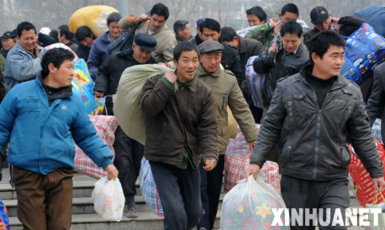 2月27日,“援川公路項目農(nóng)民工現(xiàn)場招聘會”在鄭州綠城廣場舉行,首批70多名被錄用的返鄉(xiāng)河南農(nóng)民工前往四川省江油,參加為期一年的援建公路項目。一組沉重的數(shù)字牽動著全國人大代表和全國政協(xié)委員的心:受國際金融危機影響,全國1.3億外出務(wù)工農(nóng)民工中,有2000萬失崗返鄉(xiāng)。來京參加全國兩會的代表委員帶來了大量關(guān)于完善農(nóng)民工社會保障的議案、建議和提案。重慶綦江縣委書記王越代表說:“對于農(nóng)民工而言,更加發(fā)現(xiàn)如此熟悉的城市并不屬于自己:不能享受城市最低生活保障、醫(yī)療保險和公共福利,不能申請經(jīng)濟適用房和廉租房……”新華社發(fā)