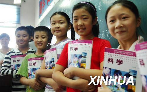 資料圖片:2008年8月30日,合肥市長江路二小六年級(2)班的學(xué)生領(lǐng)到新課本。根據(jù)國務(wù)院決定,從2008年秋季學(xué)期開始,在全國范圍內(nèi)全部免除城市義務(wù)教育階段學(xué)生學(xué)雜費。這是繼農(nóng)村義務(wù)教育經(jīng)費保障機制改革后,又一項重要民生工程,將惠及全國城市中小學(xué)生2821萬人。新華社記者李健攝