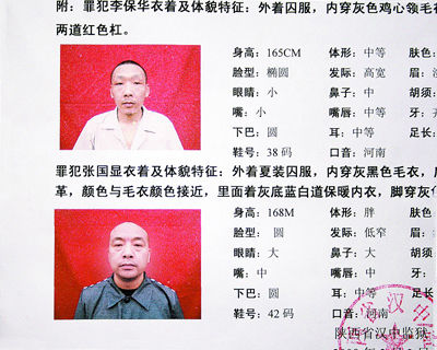 據(jù)陜西省漢中監(jiān)獄通緝資料顯示,兩名越獄的罪犯其中一人名叫李保華,又名李寶華、李寶,1972年2月2日生于河南省焦作市,小學(xué)文化,家住河南省焦作市溫縣北平皋村三組,原租住寶雞市新維巷49號(hào),是個(gè)體裝修工人。2006年10月15日,因販賣毒品罪被寶雞市中級(jí)人民法院判處無期徒刑,2007年9月5日送漢中監(jiān)獄服刑。另一罪犯名叫張國(guó)顯,1971年3月26日出生,小學(xué)文化,是河南省上蔡縣人,農(nóng)民,住上蔡縣東岸鄉(xiāng)中興村張莊15號(hào)。2007年3月9日因搶劫罪被西安市中級(jí)人民法院判處無期徒刑,2007年9月30日送漢中監(jiān)獄服刑。