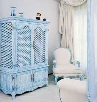 將櫥柜、墻壁、各種用具、器皿與客廳的顏色統(tǒng)一起來,在視覺上擴(kuò)大了空間。
