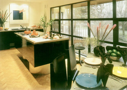 敞開式,理論上是將廚房與餐廳或客廳相連的一面非承重墻打掉,使廚房與餐廳合二為一。由于東方人的飲食習慣與西方人有較大區(qū)別,因此,設計師對敞開式廚房作了有中國特色的改造。如用一面玻璃磚墻加以分隔,既保證了油煙不外散,又可利用玻璃磚墻打造透光和折射光線的效果,使內外都感覺到明亮和通透。