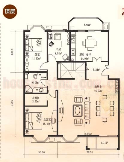 3、動靜分區(qū),樓下公共活動空間,樓上專為男女主人設(shè)計,一邊是主臥、干濕分離衛(wèi)浴、更衣室,一邊是書房、健身房、露臺,私密的空間確保生活不受干擾。