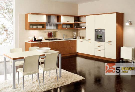 所謂“通透”,是指廚房與餐廳合并。這種情況就餐時上菜快速簡便,能充分利用空間,較為實用。只是需要注意,不能使廚房的烹飪活動受到干擾,也不能破壞進餐的氣氛。所以要盡量使廚房和餐廳有自然的隔斷或使餐桌布置遠離廚具,餐桌上方的照明燈具應該突出一種隱形的分隔感。