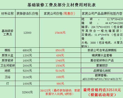 到底家裝公司與家裝游擊隊之間的報價存在多大的差距呢?隨后,記者與戴先生拿著戶型圖找到了京城某知名家裝公司請設計師為戴先生做一份報價。戴先生與設計師經(jīng)過溝通以后,將自己的心理價格告之設計師,雙方很快達成一致,一天過后,設計師為戴先生提交了一份報價單。記者將這份報價單與戴先生家裝修隊的報價進行了對比,通過家裝建材套餐的整合,家裝公司名牌主材和專業(yè)施工的最終報價為36023元,適逢該公司促銷9折活動,最終定價為32518元。