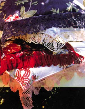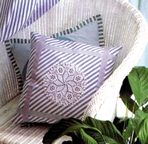 將一個(gè)機(jī)織的帶有花邊的蕾絲圖案縫在靠墊前面,可以緩和條紋靠墊的線條,而靠墊的狹長(zhǎng)條紋又恰巧為蕾絲提供了一個(gè)天然的相框。