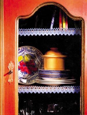粘在櫥柜架子邊上的迷人的編織蕾絲花邊,緩和了櫥柜堅(jiān)硬的邊緣線條,增添了一份舒適以及鄉(xiāng)村的感覺(jué)。