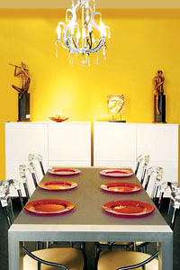 在這個春天,造型別致的新懷舊吊燈將是扮靚餐桌的不錯選擇。黃色的燈光從四周傾瀉而下,讓冰冷明亮的金屬餐具似乎都能迸發(fā)出強烈節(jié)奏。散布于柜體后的小射燈將光線聚焦于主人從各地淘來的擺件。明黃色、玫瑰色、金色在暖調(diào)燈光中躍動著,亞克力、金屬、黑橡三種元素構(gòu)建的餐桌椅與暖色的燈光形成了一種材質(zhì)與光線的游戲。