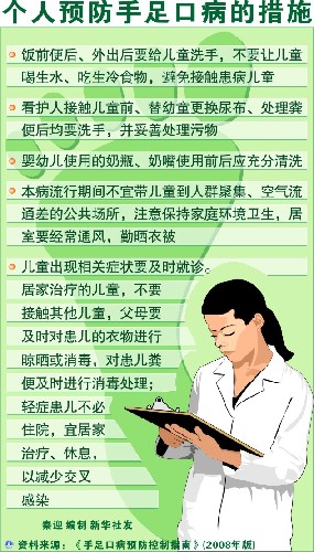 手足口病預(yù)防措施:切記“勤洗手、食熟食、喝開水、勤通風(fēng)、曬太陽”,幼托機構(gòu)等要加強晨檢制度,早期發(fā)現(xiàn),早期隔離患病兒童;加強教室、居室等環(huán)境空氣流通;做好幼托機構(gòu)日常性消毒隔離;開展衛(wèi)生宣傳,培養(yǎng)良好的個人衛(wèi)生習(xí)慣。(記者 施捷)