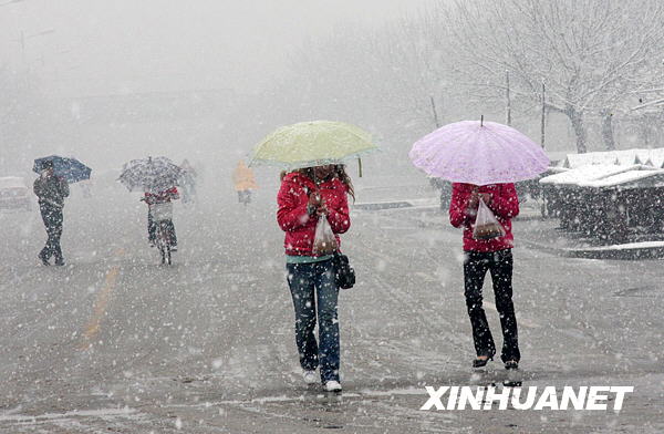 3月24日,山東濱州學院的幾名學生冒雪行走在校園里。