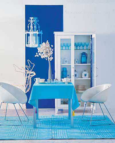 點綴:利用玻璃桌面反射的特點,改變周圍環(huán)境的色彩和紋理,就能間接地改變餐桌的個性。色澤柔和的餐布和餐具,立即使這款過于理性化的餐桌椅變得溫馨起來。