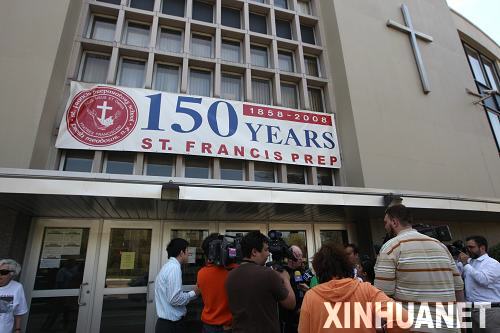 4月26日,眾多記者在美國紐約市皇后區(qū)圣佛朗西斯預科中學外采訪。當日,紐約市長布隆伯格說,美國疾病控制和預防中心已經(jīng)確認,8名來自圣佛朗西斯預科中學的學生感染了豬流感。該中學已經(jīng)宣布27日和28日停課,但紐約其它學校學生仍將正常上課。 新華社記者劉欣攝