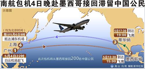 新華網(wǎng)廣州5月6日電(記者陳冀)記者從中國南方航空公司獲悉,北京時間6日凌晨2時52分,南航赴墨西哥包機從墨西哥蒂華納機場起飛,經(jīng)過約14小時的飛行,預(yù)計北京時間5月6日16時35分到達上海浦東國際機場。
