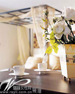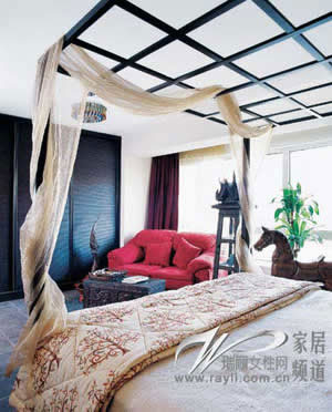 4、床架上輕薄的紗帳,為這個(gè)浪漫的小家搭建起一個(gè)甜蜜的巢