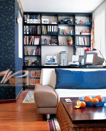 從事室內(nèi)設(shè)計(jì)的女主人將整個(gè)客廳的窗與散發(fā)著淡淡書香的敞開式轉(zhuǎn)角書桌安靜地安置于客廳一角。
