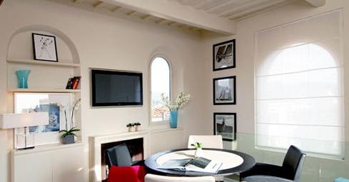 明亮、簡(jiǎn)潔的公寓客廳。雖然面積不大,卻井然有序。拱形的窗戶有著典型的意大利建筑風(fēng)格。