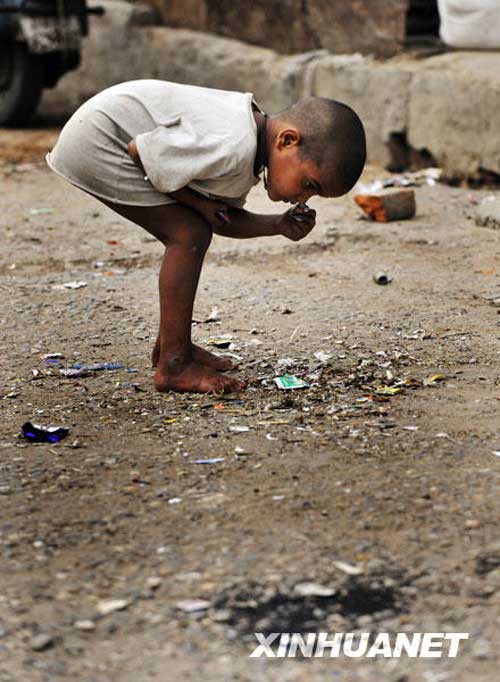 5月29日,一名兒童在印度新德里一處貧民窟內(nèi)撿拾垃圾。新華社記者王曄攝