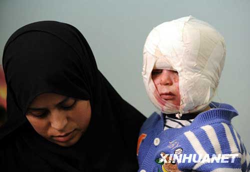 這是2歲的巴勒斯坦男孩哈桑·阿博·索非亞在加沙城的希法醫(yī)院里接受治療,他的頭部在以色列“鑄鉛”行動中受傷(1月28日攝)。新華社記者殷博古攝
