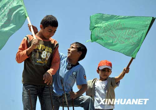 這是在約旦河西岸城鎮(zhèn)希伯倫,三名巴勒斯坦兒童揮舞著支持哈馬斯的旗幟(5月29日攝)。新華社記者殷博古攝