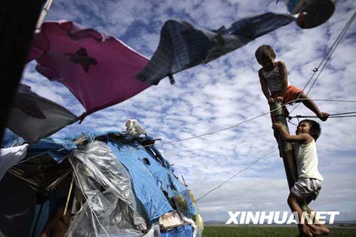 2009年1月3日,在菲律賓首都馬尼拉以南的一個漁村,兩個孩子在住處旁邊的竹竿上玩耍。新華社發(fā)(伍婧丹編輯)