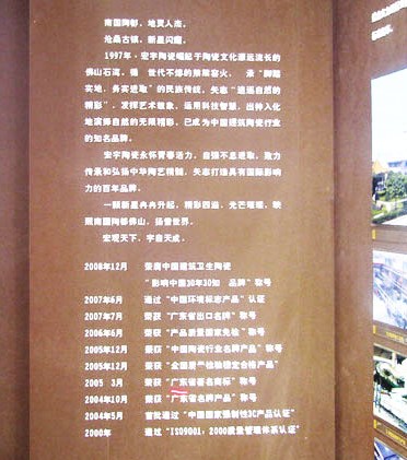 站在"創(chuàng)新營銷,揚(yáng)譽(yù)世界"專欄前,霍總興奮地回顧了宏宇開行業(yè)"體育營銷"先河的輝煌史,2003年3月27日宏宇展廳隆重開業(yè),譚詠麟、羅家英等著名香港明星應(yīng)邀到場(chǎng)祝賀。公司組織香港明星隊(duì)與廣東女足友誼賽,此舉轟動(dòng)業(yè)界,異常成功?;艨傔€介紹拍于2009年4月份廣州春交會(huì)的兩張照片,佛山市李子甫副市長(zhǎng)和廣東省方慶良副省長(zhǎng)親臨宏宇展位,為宏宇陶瓷鼓勁。