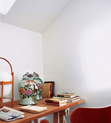 白色、灰色、原色的搭配似乎是一種小空間最為安全卻顯保守的解決方案,然而戈文的家卻并不因此顯得乏味和枯燥。他從古董店精心挑選的幾件東方彩繪陶瓷瓶被分別安排在了餐廳、客廳和臥室的角落;幾只古典圖案的刺繡靠墊隨意擺放在沙發(fā)和扶手椅上。另外,熱愛藝術(shù)的他也忘不了到巴黎的藝術(shù)區(qū)去淘購幾張原創(chuàng)的裝飾畫和海報,分別用來裝飾幾個大空間的白色墻面和窗臺。另外,盆栽植物也是必不可少的裝飾品,餐廳和臥室的幾盆綠色植物為戈文的公寓增添了一絲生機,填補沒有花園的缺憾?!耙郧昂透改缸≡谝黄?,我常常幫助他們打理花園,現(xiàn)在雖然還沒能擁有自己的花園,但我一樣細心照料這幾盆小生命。比起晚間的電視節(jié)目,它們更能讓我體會到家的氣息,我會與它們一起共同生活和成長。”戈文這樣解釋。
