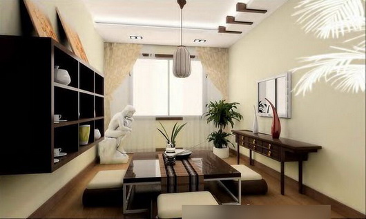 客廳的處理采用了大氣的回廊型吊頂,電視墻采用中式古典的立柱,以及具有中國(guó)傳統(tǒng)文化氣息的“印章”(壁紙)處理方式,再加上中式吊頂和胡桃木色的地板,簡(jiǎn)約中略帶中國(guó)風(fēng);整個(gè)客廳的亮點(diǎn)是立柱下的魚缸,它擺放的位置正好是整個(gè)居室的“財(cái)位”,不僅在風(fēng)水設(shè)計(jì)中體現(xiàn)中式元素,也給空間增添了生氣。