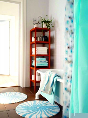 清爽浴室 干凈清爽的白磚本身就能帶給人很整潔干凈的感覺,而冰藍(lán)和純白色浴簾更在整潔中點(diǎn)綴了一絲涼爽,木質(zhì)的擱架也透露出自然的感覺。