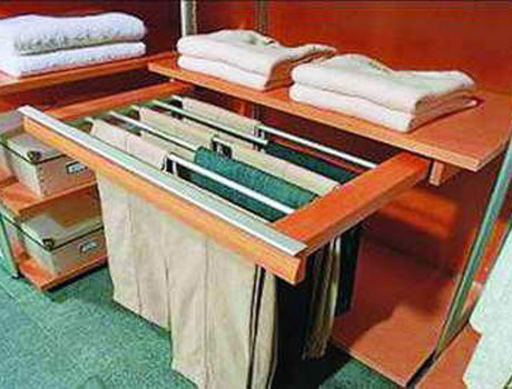 為了提高衣帽間的容積,可以選擇帶滑軌的四邊拉籃,適合存放純毛料不易折皺的衣服,不容易發(fā)霉、蟲蛀。