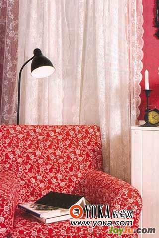 2.選擇室內主色調的對比色作為窗簾用色,可以起到平衡整體色彩的作用。此例的起居室墻面漆成桃紅色,再加上大紅色碎花沙發(fā),整體色調較為艷麗,如果再用同色系窗簾,會讓視覺負荷過重,用白色通花窗簾則剛剛好,同色羅馬窗簾補充鏤花窗簾在遮光功能上的不足。