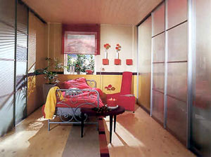 臥室里沿用了一些客廳的色彩和收納方法,留出了較大的臥室空間,避免了擁擠的感覺,便于營造靜謐的氣氛。高達(dá)天花板的書架和窗下設(shè)置的矮柜讓主人的收藏得到充分的收納和展示。床頭處安排了一面帶有隔板的背景墻,讓臥室和客廳的氣質(zhì)按照主人的喜好形成絕對的統(tǒng)一。床對面設(shè)有高達(dá)天花板的衣柜,可以把衣物和床上用品全部收納進(jìn)去,在衣柜靠窗的一側(cè)還有一個(gè)大型的書架,用來擺放書籍和CD,生活里的精神享受得到了極大的重視。