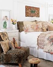 西部柔情 寬條紋的床罩和毛皮椅子是突出臥室風(fēng)格的裝飾品,簡(jiǎn)潔大方,花朵圖案的裝飾品和搭在床尾的毯子為臥室?guī)頊厝嶙匀坏娘L(fēng)情。利用織物的圖案與色彩賦予臥室剛?cè)嵯酀?jì)的視覺效果。