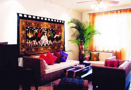 木雕佛像,燭火氳氤,薰香裊裊,煙霧繚繞,桃紅柳綠,滿眼都是濃烈的色彩,這是典型的東南亞居室。