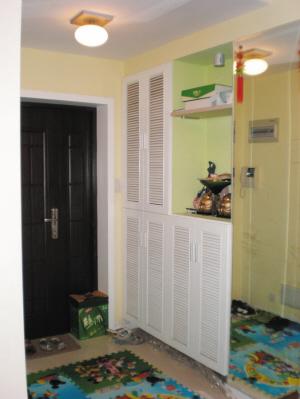 慣用做法:采用百葉門。這是一般人家裝修玄關(guān)鞋柜的慣用手法,就算業(yè)主不主動說,十個木工有九個都會按照慣性思維做成百葉門。優(yōu)點:透氣性好,裝飾效果強。缺點:由于百葉是有縫隙的,鞋子放在里面很積灰,不干凈的鞋子擺里面,臭味會竄出來,如果客人來了,一進門就聞到不潔的味道,對這個家的印象分就會大打折扣。