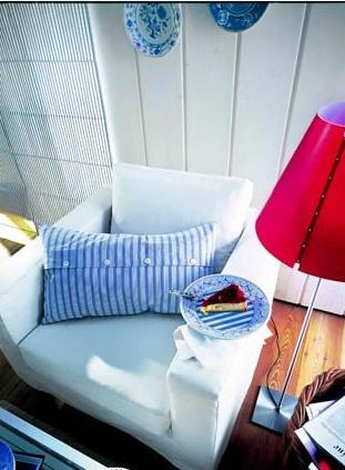 青花瓷盤(pán)也可以用高強(qiáng)度的粘貼劑貼在墻上作為裝飾,與藍(lán)白細(xì)條紋靠墊在色彩上有所照應(yīng),紅色燈罩的落地?zé)糇鳛辄c(diǎn)睛之筆,為整個(gè)休憩區(qū)更添明快時(shí)尚的氣質(zhì)。