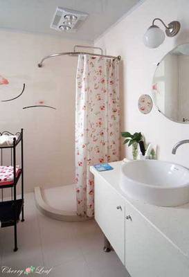 衛(wèi)生間有洗漱、妝容等功能,因此既需要有收納洗漱用具的柜子,又需要有至少一面梳妝用的鏡子。此法恰恰將這二者合二為一,將鏡子貼在水盆上方的柜門上,梳妝起來也很方便。小戶型房間的浴室往往空間狹小,因此若再采用玻璃做沖淋區(qū)的隔斷,就更顯局促。所以,在這樣的浴室空間里,宜在墻角沖淋區(qū)域用1/4圓形浴簾充當干濕區(qū)的隔斷物。