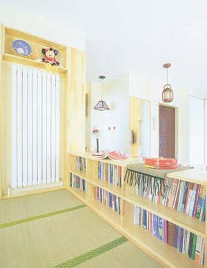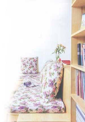 依著矮書柜打造了一個轉(zhuǎn)角的寬臺,在上面擺放了一個坐墊,寬臺很自然地就成了沙發(fā)的坐面,而矮書柜配上靠墊就是沙發(fā)的靠背,舒適的轉(zhuǎn)角沙發(fā)赫然出現(xiàn)在眼前。