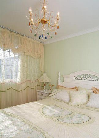 七、窗簾“二線”法。臥室中既然以床為中心了,其它飾物一般就應(yīng)有“退居二線”的襯托意識(shí)。如窗簾,面積較大,太艷、太豪華了,就會(huì)與床飾形成兩 個(gè)“中心”,以至讓人眼花繚亂。故窗簾應(yīng)選用相應(yīng)一點(diǎn)兒的色彩、圖案、面料, 像一個(gè)“仆人”站在床邊。